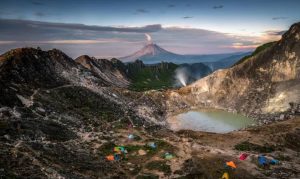 Panorama gunung dan danau kawah yang indah